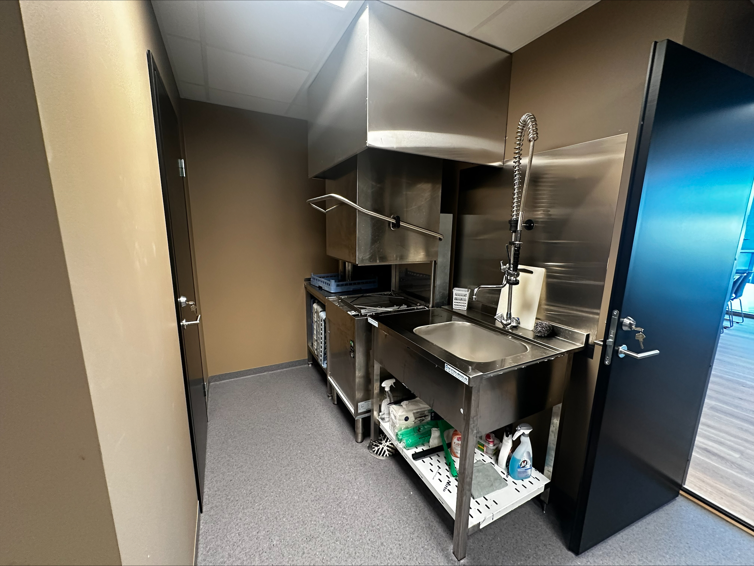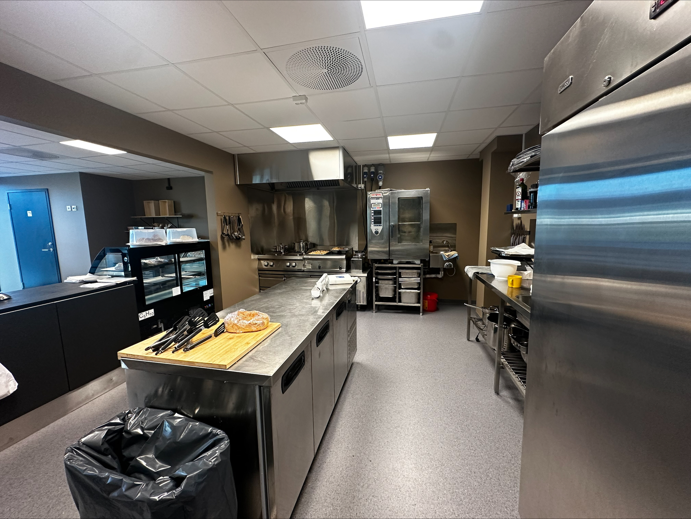 Kjøkkenet er moderne og profesjonelt utstyrt, tilrettelagt for å håndtere alt fra enkel servering til større arrangementer.
