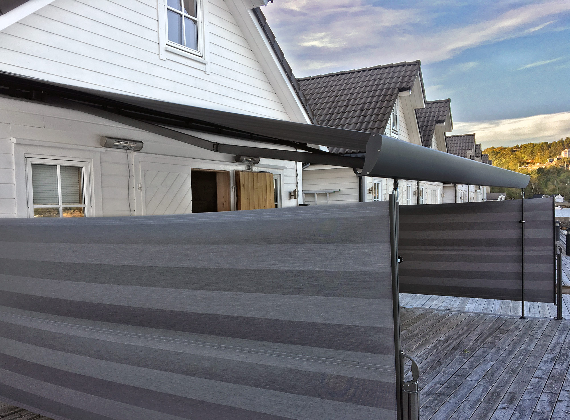 Vindskjerming fungerer som en vertikalmarkise og er ypperlig som levegg på uteplassen. Den kan integreres med bygget eller uteplassen for å gi beskyttelse mot vind og sol uten å blokkere utsikten. Dette gir både funksjonalitet og estetikk.